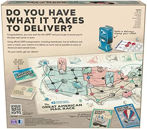 Do you have what it takes to deliver? Race around the USA and deliver as many parcels as you can in this family board game for kids and adults. Use 15 different types of Transport Card to get across the map before anyone else. Featuring planes, trains and an official USPS rocket ship. Most train games stick to the major cities, but now you can deliver letters to ‘Big Bottom’ in Dakota and drop off postcards at ‘Ding Dong’ in Texas. They’re all real places — just look them up! Stamp your slip whenever you successfully drop off (or steal) a parcel. Probably the only family board game that comes with an official USPS stamp. One of the best new board games for kids, adults and postmen. Best played with 2 to 4 players, aged 10 and up.